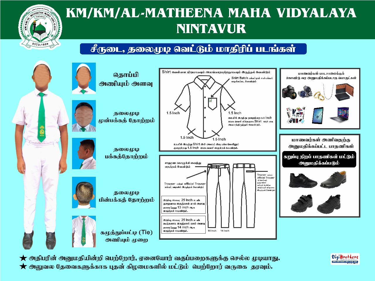 பள்ளியின் அடையாளம், ஒழுங்கு மற்றும் ஒருங்கிணைப்பை மேம்படுத்தும் முக்கிய அங்கம் சீருடை. சீருடை பயன்படுத்தும் போது பின்வரும் விதிகளை பின்பற்ற வேண்டும்.